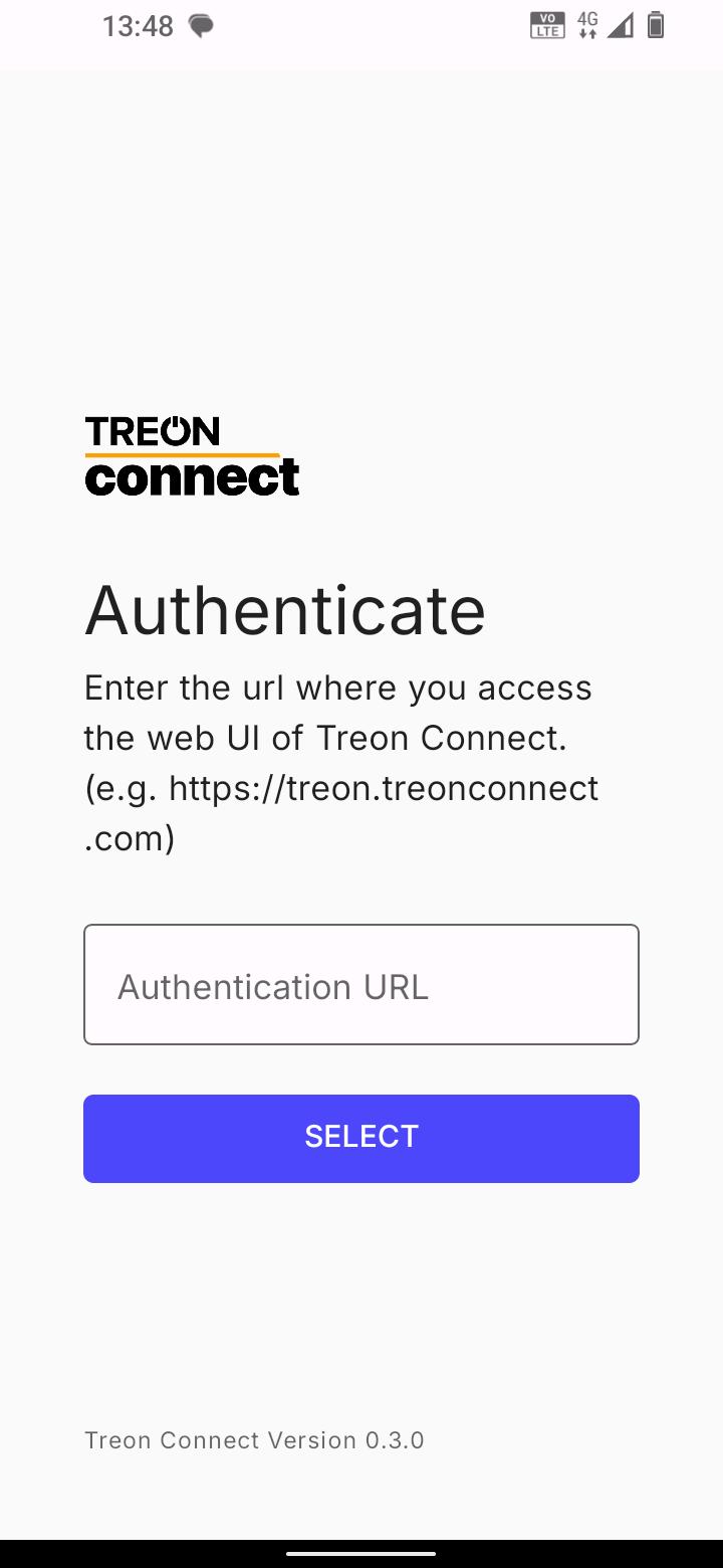 After starting the Treon Connect app for the first time, you are asked to enter the name of your Treon Connect instance. Enter the link you have received and press SELECT.