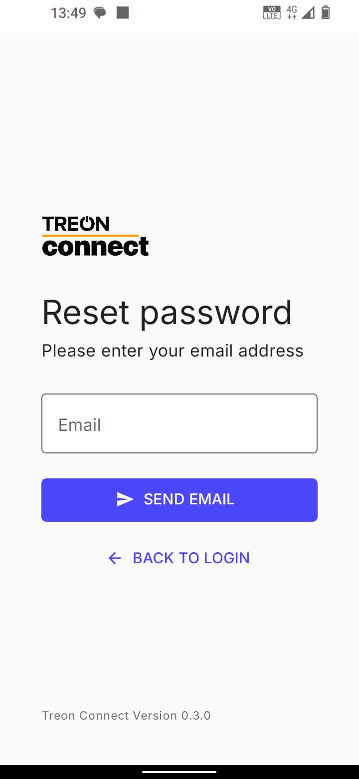 After you have selected your Treon Connect instance, you are asked to enter your email address and your password. Enter both and press LOGIN to log in.