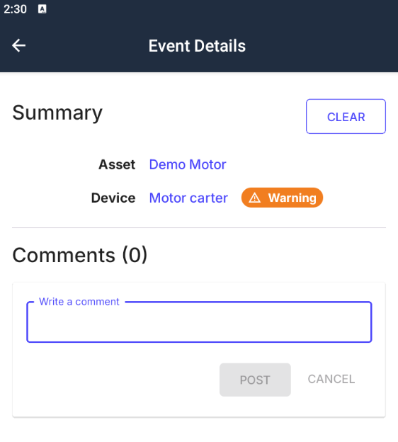 After you have successfully followed your work instructions, you can clear an Event. After clearing, it will no longer show as active in the Events list, but as cleared.