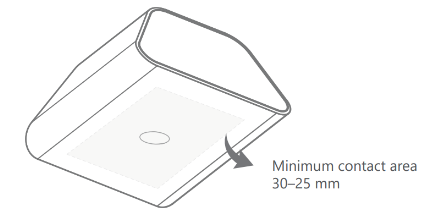 The temperature and vibration sensors in the Treon Industrial Node C are located at the base of the device. Any part of the base can serve as a contact point, but for accurate readings, the contact area should be at least 30 x 25 mm. For best results, center this contact area over the mounting location. The circular aluminum element at the center of the base transfers heat directly from the asset’s surface to the internal temperature sensor.