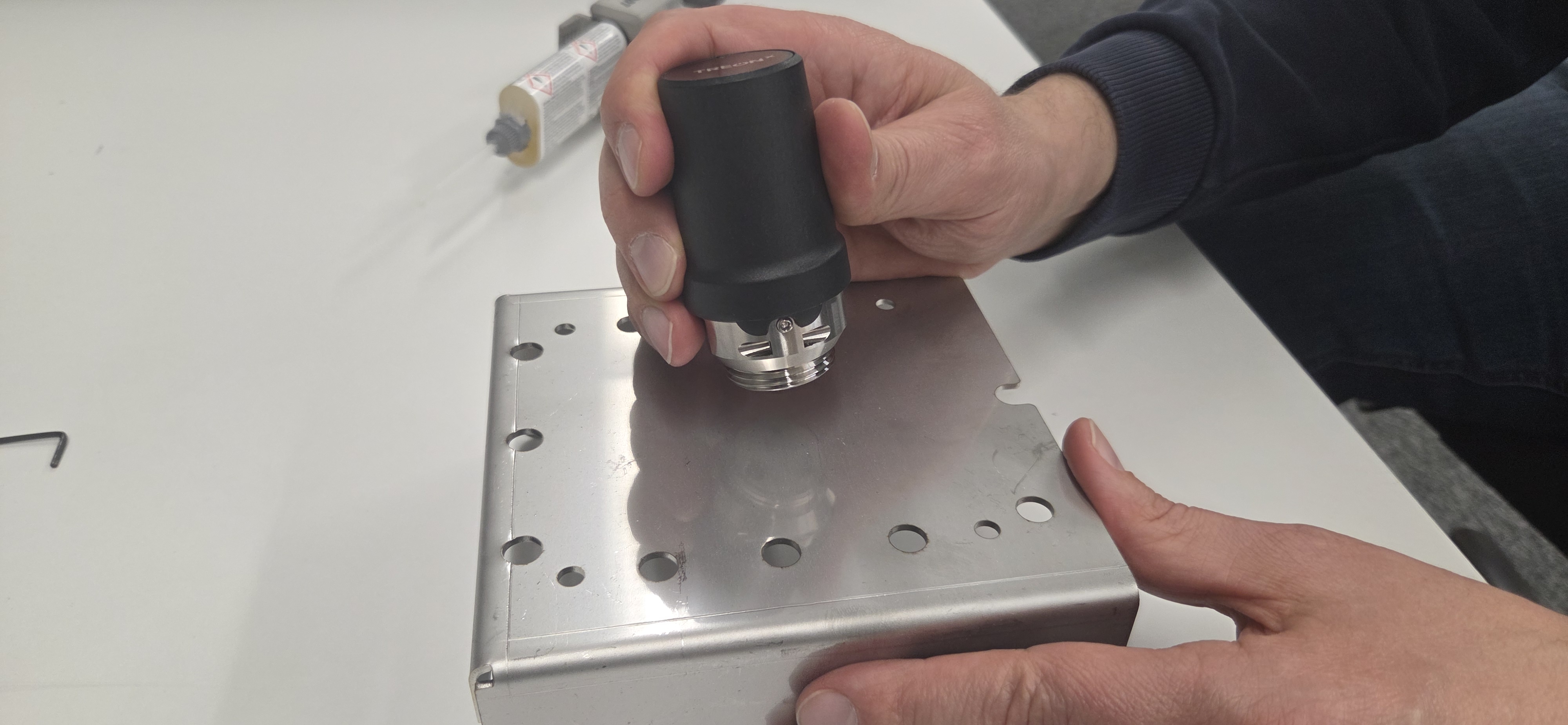 This installation method requires a completely flat and smooth surface with a minimum diameter of 31.7 mm (1.25 in). It is ideal for situations where drilling or tapping holes is not feasible. For best results, the node should be pressed firmly onto the surface until the glue or epoxy cures.